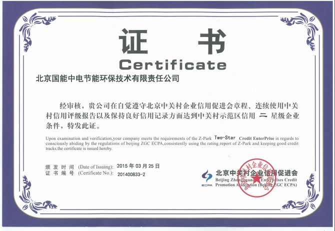 熱烈祝賀我公司榮獲“中關(guān)村示范區(qū)信用二星級企業(yè)證書”。國能中電已連續(xù)一年保持升級,證明國能中電在信用度方面贏得中關(guān)村管委會及中國人民銀行的認(rèn)可,企業(yè)融資能力不斷攀升,我公司可享受比例為25%的企業(yè)貸款貼息。