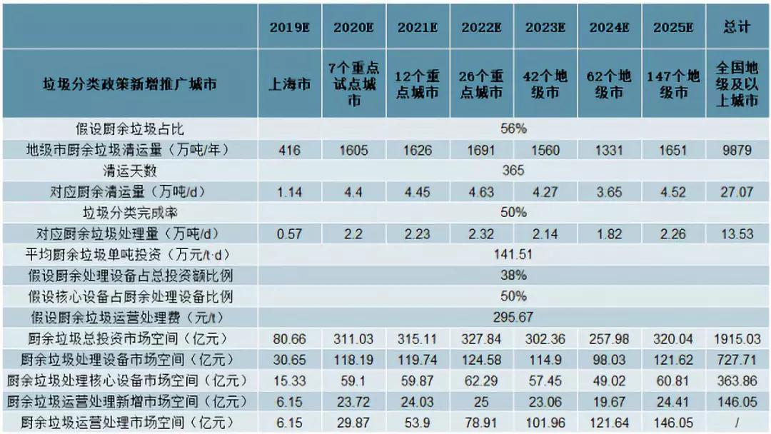 以100個(gè)餐廚垃圾試點(diǎn)城市的平均餐廚垃圾項(xiàng)目單噸投資額76.6萬元/t,處理費(fèi)197元/t作為合理估計(jì)值,可得上海環(huán)境松江、上海環(huán)境嘉定、海峽環(huán)保福州、首創(chuàng)環(huán)保寧波(一期)4個(gè)項(xiàng)目的平均廚余垃圾單噸投資額為141.5(萬元/t)。考慮到廚余垃圾的綜合處理費(fèi)較高,假設(shè)廚余垃圾處理費(fèi)是餐廚垃圾的1.5倍為295.7(元//t•d),以地級(jí)及以上城市平均每天產(chǎn)生約27萬噸廚余垃圾測(cè)算,在中性情景下(即垃圾分類完成率為50%),廚余垃圾總投資額市場(chǎng)空間為1915億;按廚余垃圾處理設(shè)備占總投資額的38%,核心設(shè)備占廚余處理設(shè)備的50%計(jì)算,對(duì)應(yīng)市場(chǎng)空間為364億;2025年廚余垃圾運(yùn)營(yíng)處理市場(chǎng)的空間預(yù)計(jì)可達(dá)146億元,市場(chǎng)空間廣闊。